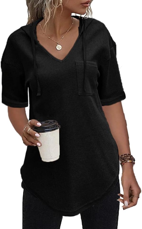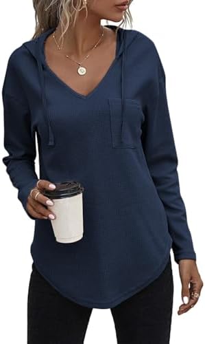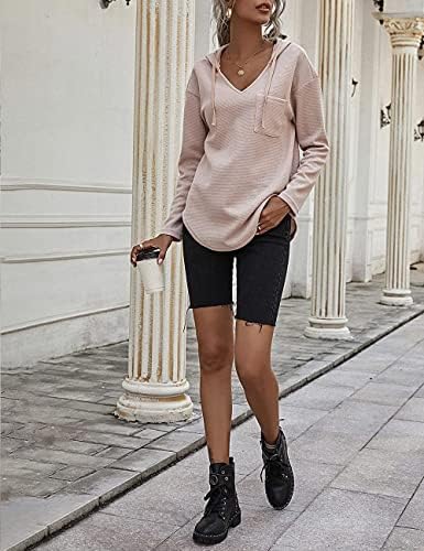 Dieses leichte Kapuzen Pull-Over für Damen ist aus weichem Waffelstrickmaterial gefertigt und bietet viel Wärme, ohne schwer zu sein. Die V-Ausschnitt Sweatshirt ist atmungsaktiv, bequem und passiert locker an der Figur, um einen modernen Stil im Alltag zu schaffen.